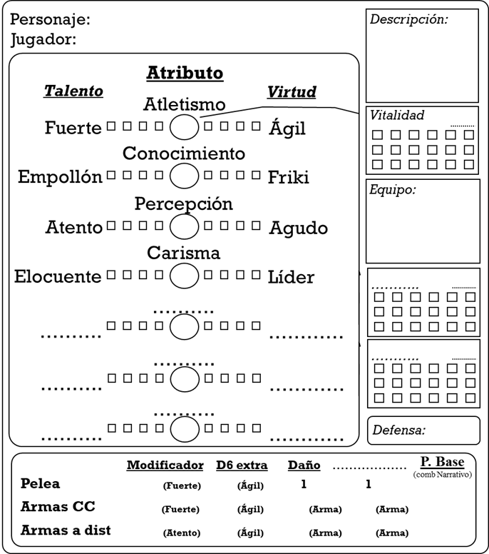 - Cada Atributo contará con un Talento, que reduce la dificultad y una Virtud, que aumenta el número de d6 que se lanzan.